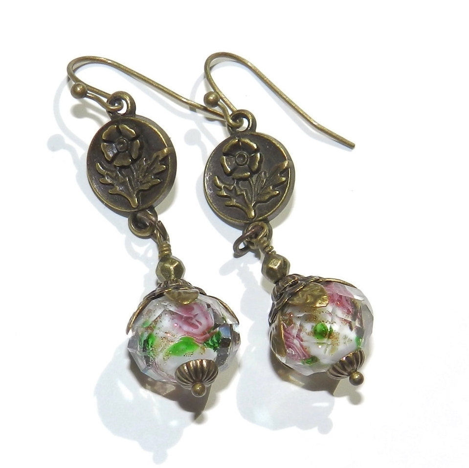 Here is a nice little array of vintage style earrings that I made with cut glass lampwork beads and antique brass findings. The little pink roses are handmade within the beads before cutting, and they are so precious for these antique style earrings. I have designed them with leadfree, nickelfree, cadmiumfree ear wires.